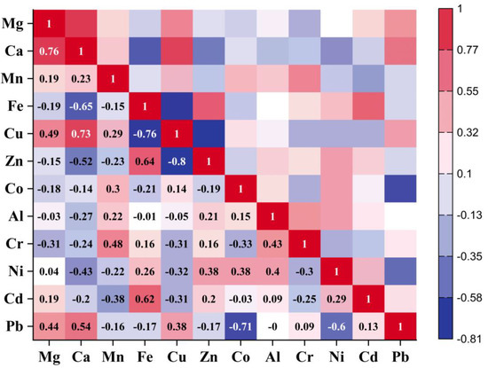 Pearson’s correlation analysis or Pearson correlation coefficient (PCC) was used to determine the sequential combinations of the original of variables and the results are displayed in matrix form. PCC is effective for assessing the strength and direction of a link between variables. In other words, large levels of confidence correlation between metals (EMs and PTMs) indicate that these metals are derived from the same source. In other words, large levels of confidence or positive correlation between metals indicate that these metals are derived from the same source and have same origin. Therefore, PCC was entrusted with investigating whether the varied metal contents in different samples of sweets were related. Figure 4 illustrates the results of the PCC test, which highlights the significant connections between the following metals: Ca–Mg (r = 0.76), Cu–Mg (r = 0.49), Cu–Ca (r = 0.73), Zn–Fe (r = 0.64), Cr–Mn (r = 0.48), Cr–Al (r = 0.43), Ni–Zn (r = 0.38), Ni–Co (r = 0.38), Ni–Al (r = 0.4), Cd–Fe (r = 0.62), Pb–Mg (r = 0.44), Pb–Ca (r = 0.54) and Pb–Cu (r = 0.38). Significant correlations were found between metals within the same clusters and principal components, indicating that the results of PCA, HCA, and PCC were all supportive.