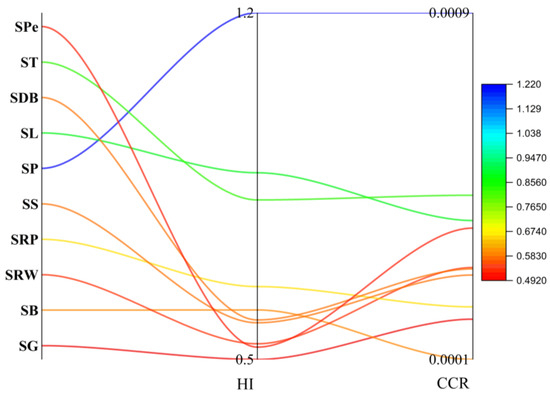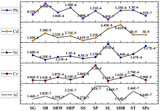 CR content was evaluated by employing the carcinogenic slope factor (CSF) from a lifetime exposure to Al, Cr, Ni, Cd, and Pb via consumption of wheat-based sweets. The threshold value is 10−4, whereas the value ≥ 10−3 can be considered serious. In SRW, SP, SDB, and ST samples, Cr was found at threshold level (Figure 7), whereas the CR value for Ni was found to be at the threshold level of cancer risk for the all samples except SB and SS samples. The higher level of Ni might be due to ghee, which is an essential ingredient for the cooking of sweets. Therefore, the findings suggest that there was little chance of carcinogenic risk due to exposure to Ni from ingesting the wheat-based sweet samples under investigation, whereas the CCR values for all samples except SDB were found at threshold levels in the current investigation, which is alarming (Figure 7). For the CCR value, the major contributors are Cr and Ni, while the rest of the metals have a negligible role.