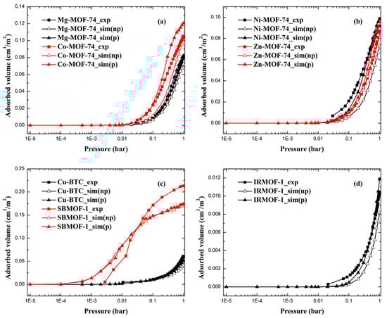 The comparison between simulated and experimental adsorption isotherms of Kr in (a) Mg-MOF-74, Co-MOF-74; (b) Ni-MOF-74, Zn-MOF-74; (c) Cu-BTC, SBMOF-1 and (d) IRMOF-1 (np: model without polarization, p: model with polarization).