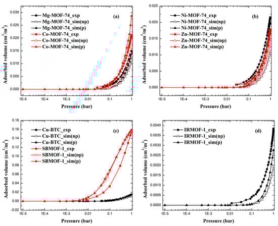 The comparison between simulated and experimental adsorption isotherms of Xe in (a) Mg-MOF-74, Co-MOF-74; (b) Ni-MOF-74, Zn-MOF-74; (c) Cu-BTC, SBMOF-1 and (d) IRMOF-1 (np: model without polarization, p: model with polarization).