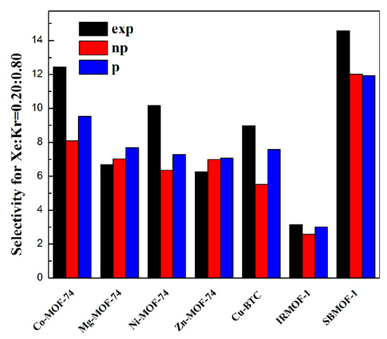 Comparison of selectivities for Xe/Kr mixture in tested MOFs obtained by experiment and models with and without polarization.