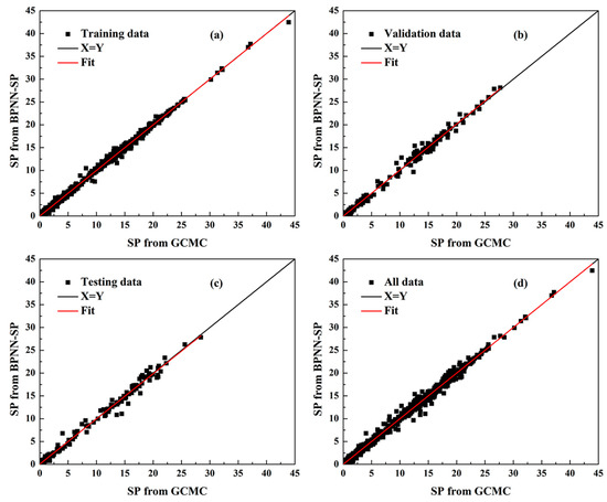 Comparison of SP value from GCMC and BPNN-SP for (a) Training data; (b) Validation data; (c) Testing data, and (d) All data.