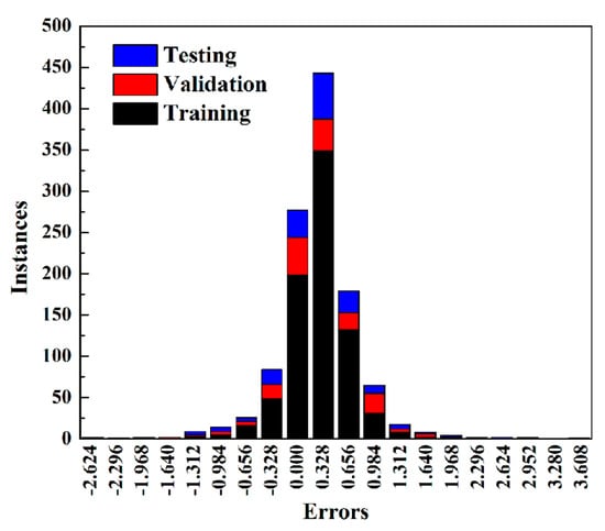 All values for various models are listed in Table 4. Overall, R values for each data set from each model were all larger than 0.96, indicating that the BPNN model appears tailor-made for predicting SP value based on physical parameters of MOF precursors, temperature and pressure with strong associativity. It is obvious that model No. 14 (denoted as BPNN-SP) is the best one with the lowest MAE, MBE, and RMSE values accompanied by the highest R value, which is higher than 0.995 for each data set. It is toted that the MBE value of the BPNN-SP model is only −0.002 mmol/g, while MAE and RMSE are the lowest ones, suggesting that the BPNN-SP model is a well-designed model for predicting the separation factor of Xe/Kr mixture in MOFs at various temperatures and pressures based on the physical parameters of the MOF precursors. In addition, Figure 4 gives an insight on the correlationship between SP values predicted by the BPNN-SP model and those simulated through the GCMC method for each data set. As can be seen in Figure 4, results of SP values from GCMC range from 0 to 42.5 mmol/g. Combining a high R value (larger than 0.995) from Table 4 for each data set, Figure 4 shows that the fit line and diagonal line was highly correlated for each data set. The error histograms for each target from the BPNN-SP model shown in Figure 5 indicate that the maximum error among all data is only 3.608 mmol/g, accounting for just one output from the testing data set. It must be pointed out that those relatively high errors are generated from data with high SP values. Therefore, those relatively high errors virtually also refer to low errors in percentage. What is more, the rate of errors settles in the range of −0.328 mmol/g to 0.328 mmol/g and can go as high as 65.0%. Even better is that about 94.3% of errors stay inside the range of −0.984 mmol/g to 0.984 mmol/g. Finally, the BPNN-SP model can well predict separation potential for Xe/Kr mixture in MOFs at various temperatures and pressures based on the physical parameters of the MOF precursors. The weights and biases of the BPNN-SP model for connection of each neuron and between different layers are listed in the Supplementary Materials S1.