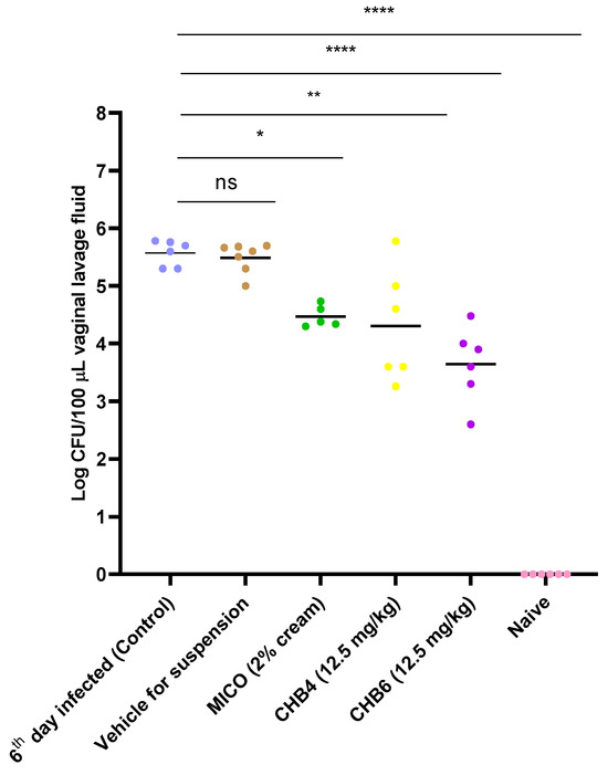 Efficacy of CHB4 and CHB6 (12.5 mg/kg) in the mouse model of VVC. Data shown are the CFUs obtained from each animal from the respective groups. The fungal burden of murine VVC was calculated on a scale of log10 (CFU/100 µL) in the vaginal lavage. MICO served as a positive control group for treatment. Points on the curve represent individual mice while horizontal lines represent the geometric mean of each group. * p < 0.05 vs. 6th day infected, ** p < 0.01, **** p < 0.0001 vs. 6th day infected.