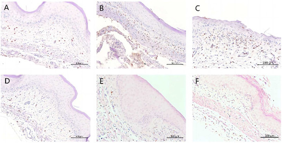 IHC analysis of vaginal tissues showed a slight presence of MPO in the Naive group (Figure 4, Panel A). In the 6th day infected group, high levels of MPO were observed (Figure 4, Panel B), demonstrating the inflammatory response during VVC infection. The CHB4- and CHB6-treated groups showed a decrease (Figure 4, Panels E and F, respectively) in expression of MPO that was similar in MPO expression as that of the MICO treated group (Figure 4, Panel D). Thus, compared to the 6th day infected and vehicle groups (Figure 4, Panel C), the lower expression of MPO observed in the CHB4- and CHB6-treated groups indicated the reduced inflammatory response due to the treatment.