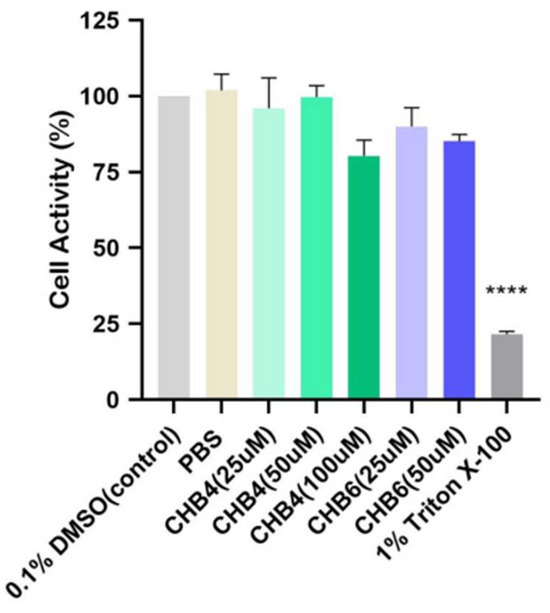 Skin irritation test of CHB4 and CHB6 on reconstructed human epidermal model. The data were analyzed by one-way ANOVA. **** p < 0.0001.