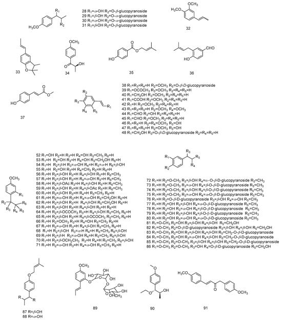Phenylpropanoids are a group of natural components containing one or more C3–C6 units, i.e., compounds consisting of benzene rings which are linked to three straight-chain carbons. The simple phenylpropanoids include phenylpropylene, phenylpropionic acid and phenylpropionaldehyde. There are a large number of C3–C6-type structural compounds in the genus Anise, and anisole (33) [63,64] was the first to be obtained from SAO produced from anise seeds in 1937. Later, many prenylated C3–C6 compounds were isolated from the fruits, leaves and roots of star anise. Most of the new compounds found in star anise are phenylpropanoids (30, 31, 39, 48, 52, 74–86, 89, 90, 93, 94, 99–104, 107–109, 115–120 and 124–131) [61,65,66]. The phenylpropanoid compounds isolated from star anise have diverse structures. In addition to some simpler phenylpropanoids (32–37, 40–47, 52–67, 70 and 91–95) [54,56,58,60,63,64,65,67,68,69,70], they also include some new phenylpropanoid glycosides formed by combining with glucopyranoside structures (50, 51, 28–31, 38, 48, 49, 72–78, 79, 80 and 82–86) [60,61,71]. Most of these phenylpropanoid compounds come from the fruits of star anise. (E)-1,4-bis(4-methoxyphenyl) but-3-en-2-one (91) [72] is obtained from the bottom of the distillation kettle of star anise and obtained by liquid separation and purification. 1-(4′-methoxyphenyl)-(1R,2S and 1S,2R)-propanediol (50) [61] exhibited the highest stability in a dose-dependent manner in an in vivo experimental model of tumor-necrosis-factor-induced septic shock, and this effect was accompanied by a reduction in plasma alanine aminotransferase levels.