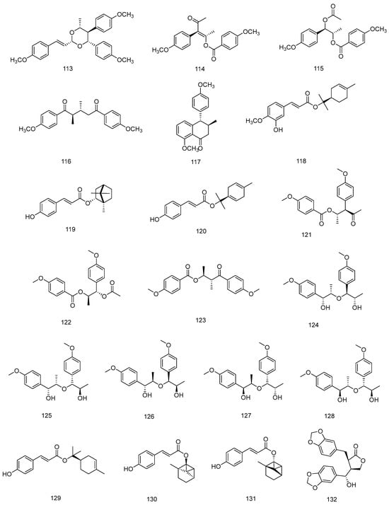 In 1998, Sy and Brown isolated novel lignans from anise leaves (98–102 and 105–107) [66], and later these compounds were also found in anise fruits [67,69]. The compounds verimol A (98) and harmandianone (92) showed concentration-dependent significant inhibition of lipopolysaccharide-induced tumour necrosis factor production in RAW264.7 cells [69]. Compounds 96, 97, 103, 104, 108, 111 and 112 are known lignan-like compounds that are found in anise [67,73]. In 2022 [33], six new lignans and phenylpropanoid derivatives, illiciumiones AF (114–118) were isolated from the anise fruits. Although relatively few lignans have been found in anise so far, most of them are novel compounds. The phenylpropanoids isolated from Illicium verum are shown in Table 3, and chemical structure is shown in Figure 2, Figure 3 and Figure 4.