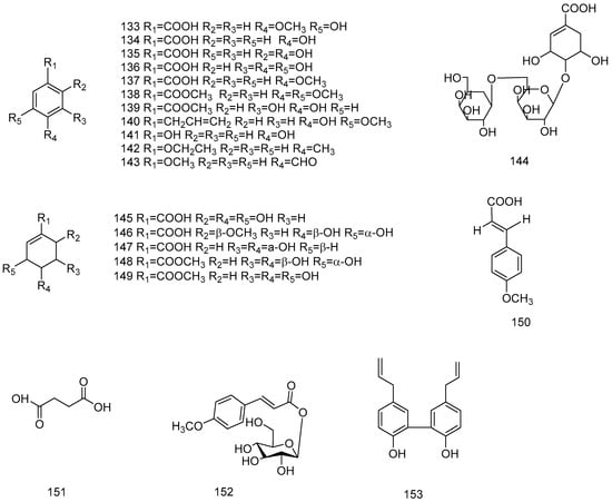 Organic acids and phenols in star anise include aliphatic organic acids (144–149, 151) [58,60,69,73] and aromatic organic acids (133–143, 150, 152, 153) [60,70,73]. All 20 organic acids are derived from the fruits of star anise. The composition of organic acids in star anise fruits is complex, and shikimic acid is the most important component. The organic acids and phenols isolated from Illicium verum are shown in Table 4, and chemical structure is shown in Figure 5.