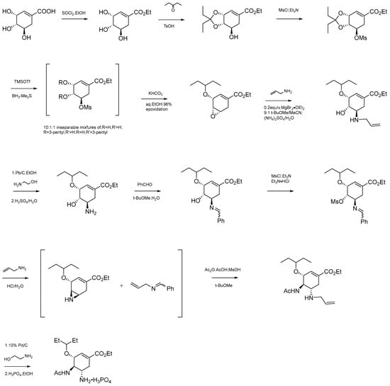 - Sagandira, C.R.; Mathe, F.M.; Guyo, U.; Watts, P. The evolution of Tamiflu synthesis, 20 years on: Advent of enabling technologies the last piece of the puzzle? Tetrahedron 2020, 76, 131440. [Google Scholar] [CrossRef]