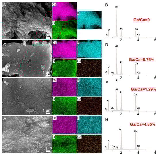 SEM images, EDS mapping and spectra of Ga-HAp with different Ga concentrations. (A,B) HAp, (C,D) 10 Ga-HAp, (E,F) 25 Ga-HAp, (G,H) 50 Ga-HAp.