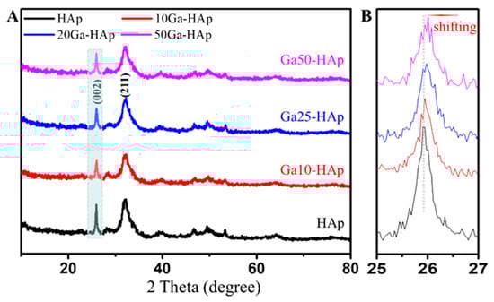(A) XRD patterns of Ga-doping HAp with different Ga concentrations; (B) enlargement of the diffraction peak of the (002) lattice plane of the samples.