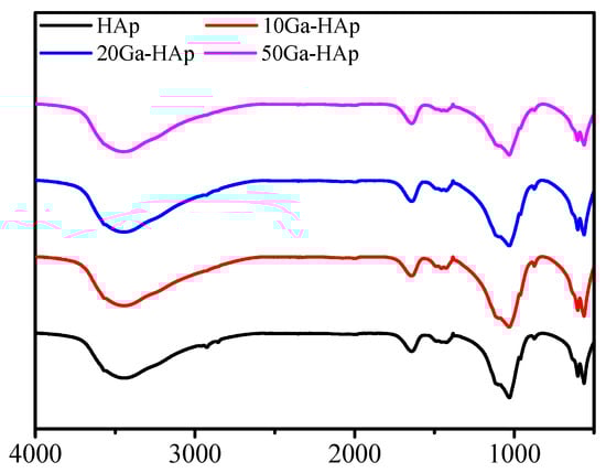 We conducted XRD analysis to investigate the crystal phase of the product (Figure 3). The results revealed that no other crystal phases were present in the product apart from the HAp crystal phase, indicating that the introduction of Ga did not lead to the formation of other crystal phases. Additionally, it is noteworthy that previous research has reported Ga’s ability to inhibit the nucleation and growth of HAp crystals [25]. Therefore, relative to the HAp control samples, the introduction of Ga should result in a reduction in crystallinity, manifesting as broadening of XRD peaks. The crystalline peak at around 25° corresponds to the (002) crystal plane diffraction of HAp. It can be observed from the XRD pattern that with the introduction of Ga, the relative intensity of the (002) crystal plane diffraction peak decreased. Hence, we can deduce that Ga can inhibit the preferential growth of HAp along the c-axis direction. Furthermore, as the amount of introduced Ga increased, the (002) crystal plane exhibited a shift towards higher angles. This observation suggests that the incorporation of Ga induces a contraction in the unit cell volume of hydroxyapatite. This phenomenon can be attributed to the smaller ionic radius of Ga (0.062 nm) in comparison to Ca (0.099 nm). Notably, this outcome corroborates findings reported in other studies [26]. Combining these results with the TEM analysis, it is apparent that during the synthesis process, HAp tends to spontaneously grow along the c-axis, leading to the formation of rod-shaped nanocrystals, with the long axis of the nanorods aligned along the c-axis. However, the introduction of Ga suppresses the growth of nanorods along their long axis, thereby inhibiting their c-axis-oriented growth tendency. As the Ga content increases, this inhibitory effect becomes more pronounced [23]. Furthermore, the results of the FTIR analysis indicate that the introduction of Ga does not lead to significant changes in the chemical composition of the product (Figure 4). Simultaneously, the results reveal distinct carbonate absorption peaks in the infrared absorption spectrum. These carbonate ions might originate from the hydration of carbon dioxide in the air during the synthesis process, leading to the formation of carbonate ions. These carbonate ions then enter the HAp lattice, resulting in the formation of carbonated hydroxyapatite. This phenomenon has been extensively reported in the literature [27,28].