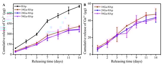 (A) Cumulative releasing profile of Ca2+ from the as-prepared powders; (B) Cumulative releasing profile of Ga3+ from the as-prepared powders.