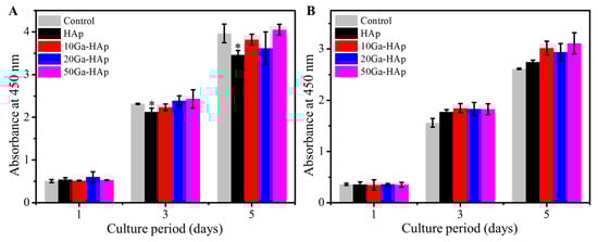 (A) Proliferation of mBMSCs with the HAp and Ga-doped-HAp powders; (B) Proliferation of mBMSCs with the HAp and Ga-doped-HAp bulks. Polystyrene discs with a diameter of 1 cm were used as a control group, and * represents that a significant difference exists as compared with the control group.