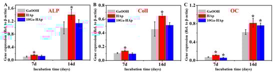 Relative expression level of ALP (A), ColI (B), and OC (C) as cultured on the surface of the bulk materials for 7d and 14d. GaOOH discs with a diameter of 1cm were used as a control group. * represents that a significant difference exists as compared with the control group.