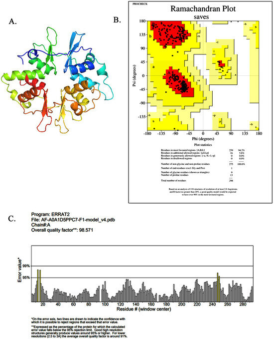 In this study, the γ1-subunit of the chicken AMPK model was obtained using AlphaFold2 online prediction (Figure 1A). Subsequently, ERRAT and PROCHECK were used to check the reliability of the created protein model and the three-dimensional structure error [23]. As shown in Figure 1B, the results showed that 94.2% of the residues were located in the most favorable region of the plot, indicating that the model is valid. The structure’s reliability score for each residue was determined to be 98.571 (Figure 1C), signifying a high level of accuracy and confidence. This score validates the usability of the model for subsequent studies. The findings conclusively indicate that the Ch-AMPKγ1 structure is not only compatible but also of excellent quality, establishing its credibility and suitability for further investigation.