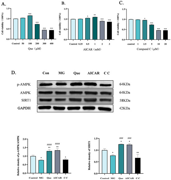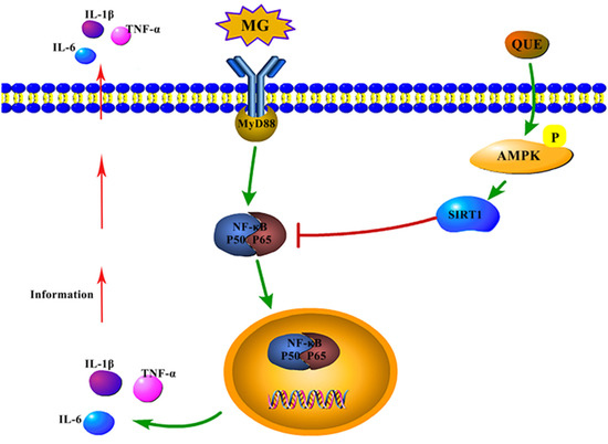5’-adenosine monophosphate (AMP)-activated protein kinase (AMPK) is a key regulator of cellular energy, and it maintains cellular energy homeostasis by coordinating many pathways [14]. Some evidence has indicated that AMPK relies on its downstream protein SIRT1 to inhibit inflammation in pathological conditions [15,16,17]. SIRT1 is a kind of NAD (+)-dependent deacetylase that acts as a downstream protein of the AMPK signaling pathway and exerts anti-inflammatory effects by inhibiting NF-κB [18,19,20]. Quercetin was shown to achieve anti-inflammatory effects by activating the AMPK/SIRT1 pathway [21], but it has not been reported whether quercetin can inhibit MG inflammatory damage by activating the AMPK pathway.
