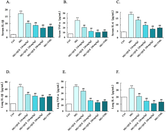 To identify the anti-inflammatory effects of quercetin, ELISA was used to detect the release of marker inflammatory cytokines in serum and lung tissue due to MG infection. Compared to the control group, the marker inflammatory cytokines increased significantly in the serum and lungs of the MG group (p < 0.01). It has been found that the quercetin treatment group was consistent with the tiamulin group, and the serum and lung levels of IL-1β, IL-6, and TNF-α were significantly reduced compared with the MG group in a dose-dependent manner (Figure 4A–F, p < 0.01).