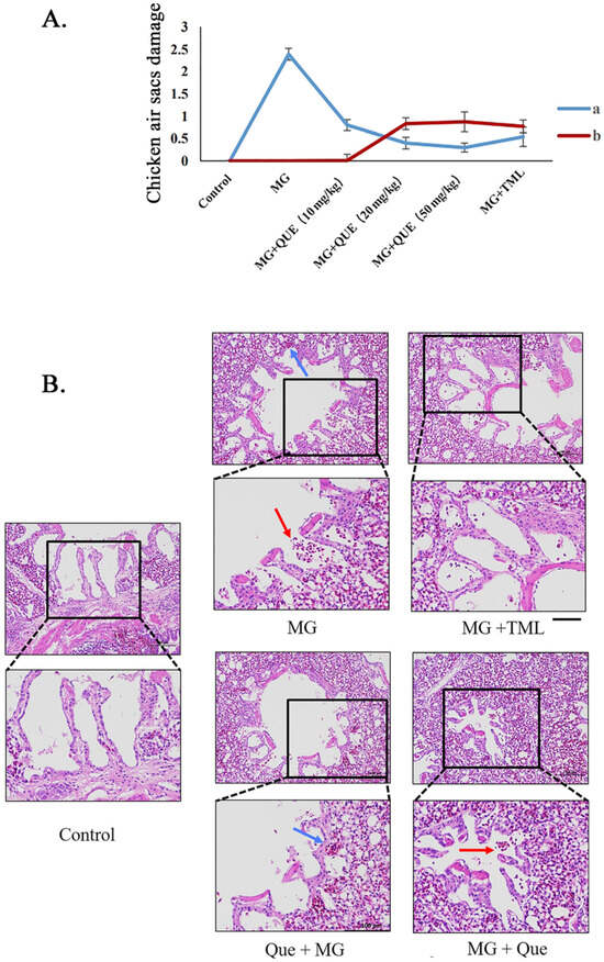 Quercetin alleviates air sac and lung damage in MG-infected chickens. (A) Evaluation of air sac pathologic damage in MG-infected chickens, where a represents the air sac damage score of different groups and b represents the airbag damage reduction rate. (B) HE staining to detect the pathological changes in lung inflammation caused by quercetin-inhibiting MG infection. The red arrows point to inflammatory cells, and the blue arrows point to red blood cells. Scale bar = 100 μm.