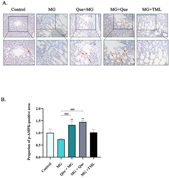 Effect of quercetin on the expression of MG-induced protein in CP-II cells. (A) The expression level of p-AMPK in chicken lungs was detected using immunohistochemistry. The brown color indicates the p-AMPK region. The red arrow points to the positive stained area. Scale bar = 100 μm. (B) Image-J software analyzed the proportion of positive area in immunohistochemical results (n = 3). Values are expressed as mean ± SD. ** p < 0.01 versus control; and ### p < 0.001 versus MG.