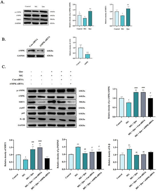 These results have confirmed that quercetin inhibits the lung inflammation induced by MG infection and reverses the inhibition of AMPK activity. Several pieces of evidence showed that SIRT1 was a downstream target of the AMPK signaling pathway and participated in anti-inflammation through the suppression of NF-κB p65 activation [18,19,20]. To further verify whether quercetin exerts anti-inflammatory effects in MG-infected CP-II cells via the AMPK/SIRT1/NF-κB pathway, we artificially reduced the expression of the AMPK gene in CP-II cells using AMPK-siRNA (Figure 7B, p < 0.001). An MG-induced inflammatory damage model continued to elucidate the anti-inflammatory effects of quercetin therapy. The results from Figure 7C showed that the ratio of p-AMPK/AMPK in the MG group was lower than in the control group (p < 0.05), indicating that MG inhibited the expression levels of p-AMPK and SIRT1. However, the ratio of AMPK/AMPK and the SIRT1 protein level increased significantly, while the ratio of p-p65/p65 and IL-1β reduced remarkably in the quercetin-treated CP-II cells compared to the cells exposed to MG only (p < 0.01). It is worth noting that the above trend caused by quercetin is reversed by siRNA-AMPK. Compared to the MG group, the quercetin-treated group significantly decreased the relative expression of p-NF-κB and IL-1β with the activation of the AMPK/SIRT1 pathway (Figure 7C, p < 0.05). The combined data in Figure 7 further confirmed quercetin’s anti-inflammatory effect by regulating the AMPK/SIRT1/NF-κB pathway.