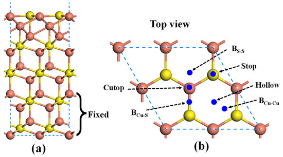 2.1. Adsorption of Au Atom on Pristine Cu2S(111)