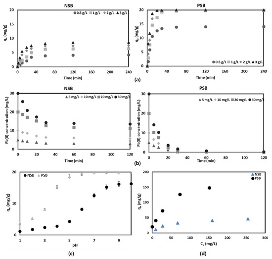 Figure 4a, it can be confirmed that PSB has about 2.32–3.35 times higher adsorption efficiency than NSB, and reached the maximum adsorption amount rapidly. This result is thought to be because, as already mentioned in the physical analysis of the adsorbent and the surface analysis of the adsorbent, the pore size of the adsorbent was changed in favor of Pb(II) adsorption after the introduction and phosphorylation of various functional groups and phosphate groups on the surface of the adsorbent. This is in agreement with many previous research results [