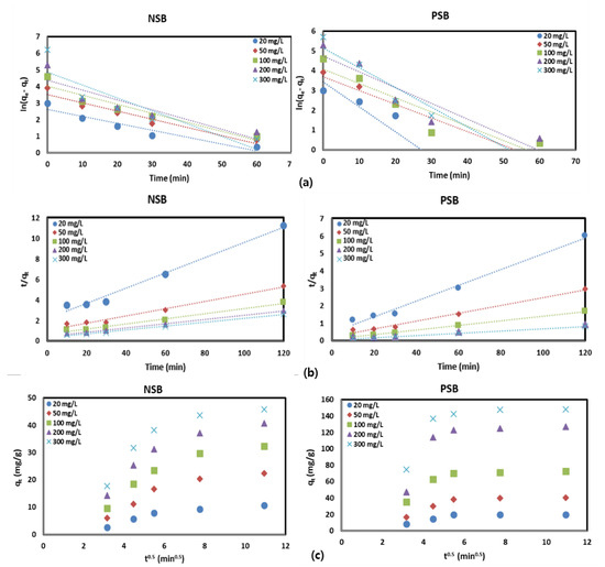 Figure 5c, it can be seen that pore diffusion and intraparticle diffusion are the rate-limiting steps in the Pb(II) adsorption process using NSB and PSB. The values of k