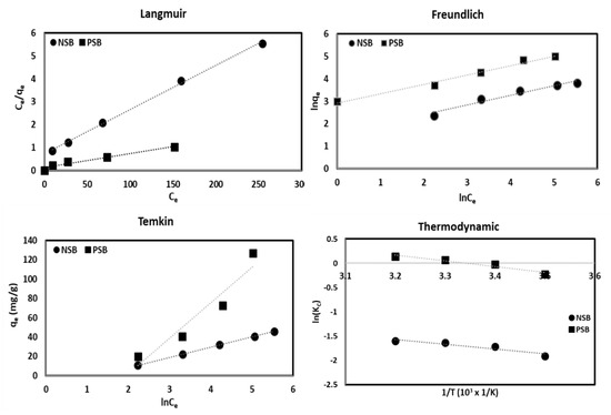 LCo)) calculated in the Langmuir equation was found to be 0.1141 for NSB and 0.0631 for PSB, making the adsorption process favorable. Temkin isothermal adsorption constant (B) was calculated at 10.60 for NSB and 36.79 (J/mol) for PSB, NSB corresponds to the physical adsorption region (B < 20 J/mol), whereas PSB corresponds to the chemical adsorption region (B > 20 J/mol). Therefore, the adsorption of Pb(II) by NSB was closer to physical adsorption caused by the action of the van der Waals force, which consists of dispersing and electrostatic forces, rather than chemical adsorption, in which the chemical form of the adsorbent changes due to the reaction between the adsorbent and the adsorbent. However, adsorption by PSB was closer to chemical adsorption by hydrogen bonding, ion exchange, covalent bond, ionic bond, and complexation due to various functional groups on the adsorbent surfaces and Pb(II). The K