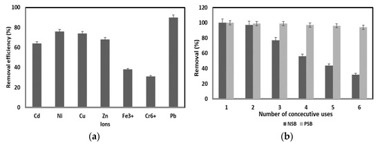 Figure 8a). Although the adsorption efficiency of Pb(II) decreased compared to the single ion experiment without competing ions, the adsorption efficiency was 88–92%, indicating that it was not significantly affected by other ions. This is a favorable signal that there is a possibility of effectively adsorbing Pb(II) by applying PSB to actual industrial wastewater.