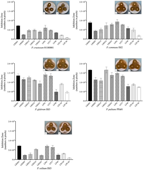 Antifungal potential of ten LAB cultures (107 CFU/mL) on MRS agar overlaid with a suspension of five Penicillium strains. Results were expressed as the inhibition zone area (number in pixels). The values represent mean ± SD. Images showed the inhibition zones of L. rhamnosus LRH01 (A) and L. plantarum LP01 (B) against each mold after incubation for 3 days at 25 °C, respectively. LRH01, LRH05, LRH14, LRH16, and LRH43 were L. rhamnosus strains; LP01, LP37, and LP48 were L. plantarum strains; LPC44 and LPC46 were L. paracasei strains.