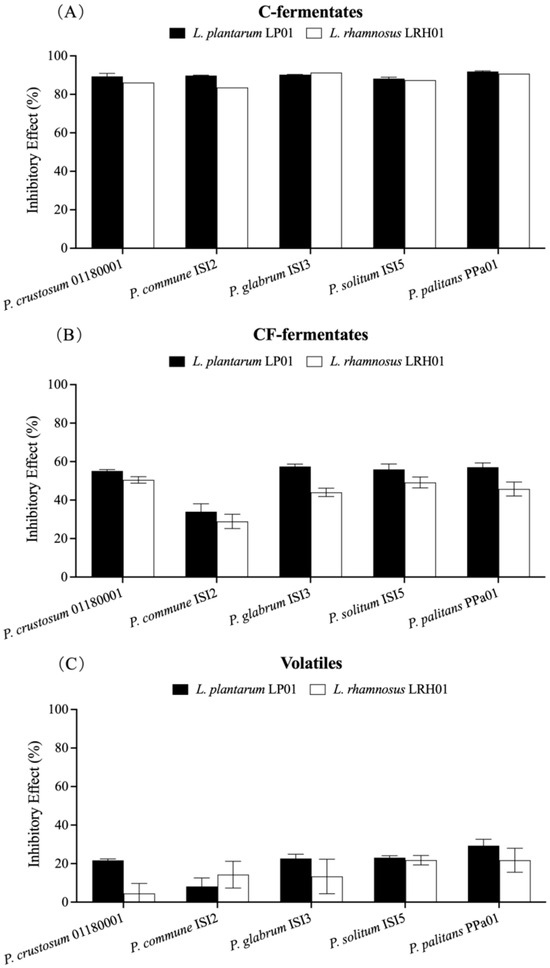 Inhibitory effects (%) of C-fermentates (A), CF-fermentates (B), and volatiles (C), respectively, produced by L. plantarum LP01 and L. rhamnosus LRH01 in yoghurt serum against five Penicillium strains. Control groups were prepared by spotting each mold suspension on the plates prepared by mixing un-inoculated MRS broth with agar. Error bars represent the standard error of the mean of three replicates.