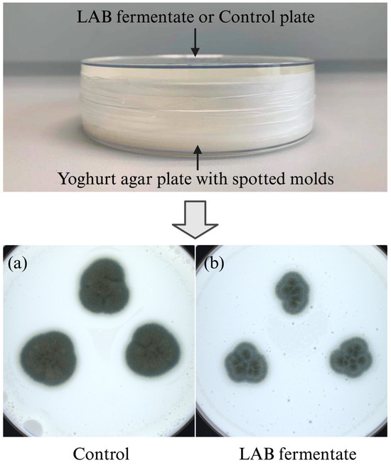A yoghurt agar plate was inoculated with 10 μL of each mold spore suspension at 1.0 × 104 spores/mL (100 spores/spot) in triplicate. The LAB C-fermentate agar plate (prepared as described above) was positioned upside down on the yoghurt agar plate, and the two plates were securely sealed together using parafilm. The inhibitory effect was assessed after incubation for 5 days at 25 °C following the procedure outlined in Section 4.4.1.