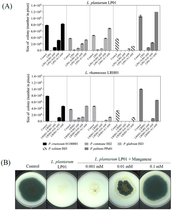 Here, a commercial plain yoghurt was used as a matrix to ensure a realistic manganese level. The Penicillium strains showed various levels of sensitivity when grown with L. plantarum LP01 or L. rhamnosus LRH01 on yoghurt-agar plates with or without manganese (Figure 4A). In comparison to the control groups, the growth of the five Penicillium strains was markedly inhibited by both L. plantarum LP01 and L. rhamnosus LRH01 in yoghurt. However, mold growth was partially or fully restored when manganese was added in increasing concentrations from 0.001 mM to 0.1 mM. For example, P. crustosum 01180001 growth was completely inhibited by L. plantarum LP01 in yoghurt, but the addition of manganese at 0.1 mM resulted in fully restored mold growth (Figure 4B). Although supplementation of manganese also restored the mold growth in yoghurt prepared with L. rhamnosus LRH01, it is worth noting that, in comparison to L. plantarum LP01, the L. rhamnosus LRH01 seemed more efficient at removing manganese since higher amounts of manganese were required to restore mold growth, especially in the case of P. solitum ISI5 and P. palitans PPa01 where growth could not be restored even after 0.01 mM manganese was added. In the case of L. plantarum LP01, the growth of most tested molds could be partially restored when 0.001 mM of manganese was added, while in the case of L. rhamnosus LRH01, 0.01 mM of manganese was required.