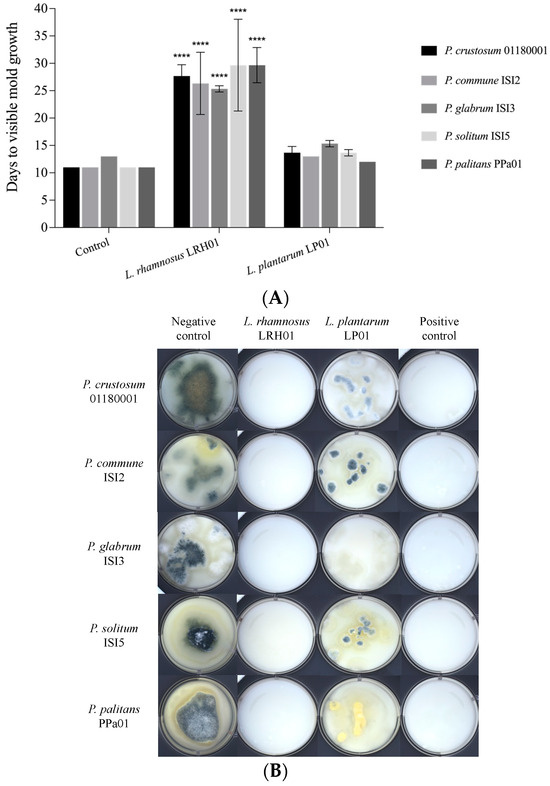 (A) Days of visible mold growth delay caused by L. rhamnosus LRH01, L. plantarum LP01, and LR4PD (positive control). Wells with indicator molds but without either L. rhamnosus LRH01 or L. plantarum LP01 served as negative controls. The values were expressed as the mean values of three replicates. Significant statistical differences compared with the control group were all at **** p < 0.0001. (B) Images of yoghurt with spotted molds after incubation for 22 days at 7 °C.
