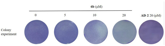 HepG2 cells were seeded in six-well plates with 500 cells per well. After an incubation period of 12 h, 6b (0, 5, 10, and 20 μM) was added to the cells, respectively. The cells were cultured in a cell incubator for 14 days and the culture medium was changed every 3 days. Then, it was fixed with 4% paraformaldehyde for 15 min and dyed with 0.1% crystal violet for 30 min. After cleaning with PBS, photos were taken of the six-well plate [41].