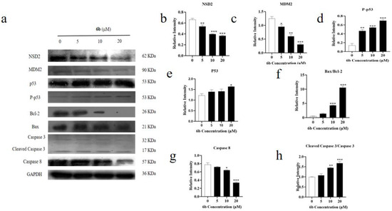 In the present study, we evaluated the cytotoxic activity of 15 amino acid derivatives of AD-2 by using an MTT assay and found that their anti-toxicity to hepG2 cells was superior to AD-2 itself. In addition, we investigated the cytotoxicity of the AD-2 derivative 6b, which has good HepG2 cytotoxicity, on three types of normal cells, HSC-T6, L929, and BEAS-2B. We found that their cytotoxicity to normal liver cells was weaker than that to HepG2 cells. Accordingly, we selected 6b and carried out a Western blotting analysis to study the potential mechanism. As shown in Figure 8, the expression of NSD2, MDM2/p53, and Caspase 8 were lowered, while P-p53, Bax/Bcl-2, and Cleaved caspase 3/caspase 3 expressions were elevated to perform an anti-tumor effect. It was discovered that 6b lowered NSD2, MDM2/p53, and caspase 8 expression while increasing P-p53, Bax/Bcl-2, and Cleaved caspase 3/caspase 3. These findings showed that 6b may control apoptosis.