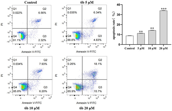 Detection of apoptosis of HepG2 cells induced by 6b administration by flow cytometry. The cell apoptosis ratio is calculated based on the sum of the number of Q2 and Q3 phase cells in the figure. (** p < 0.01, *** p < 0.001).