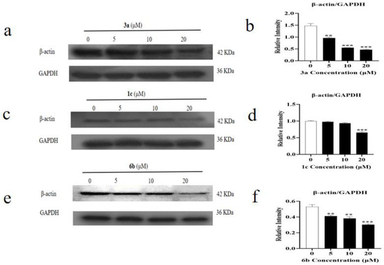 Mechanisms of derivative 6b inducing the HepG2 cytoskeleton. (a–f) 3a, 1c, 6b administration promotes the ablation of β-actin in HepG2 cells by Western blotting assay. Data are expressed as means ± SDs of triplicate experiments performed independently (** p < 0.01, *** p < 0.001).