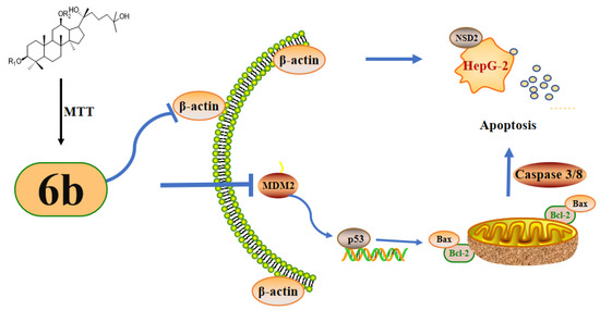 Proposed mechanism of compound 6b for promoting apoptosis of HepG2 cells. To enhance the anti-hepatoma activity of AD-2, the amino acid derivatives of AD-2 were introduced in the previous work. The amino acid derivative 6b with high efficacy and low toxicity was screened by MTT assay. It has an excellent ability to resist the proliferation of hepatoma cell HepG2. The mechanism study found that 6b could destroy the cytoskeleton, regulate the MDM2/p53 signaling pathway, increase the expression level of Bax/Bcl-2, and activate Caspase3/8 system, thus causing apoptosis, which was also verified by flow cytometry.