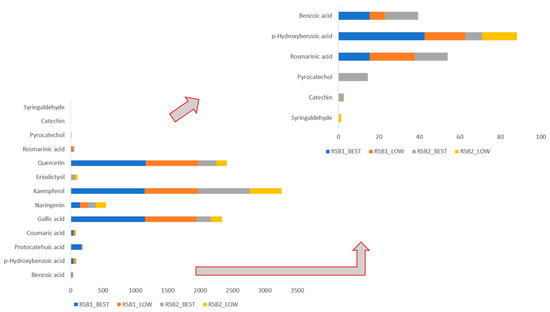 | Phenolic Compound | RSB1_BEST | RSB1_LOW TPC | RSB2_BEST | RSB2_LOW TPC |