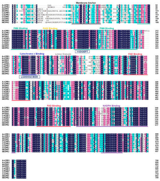 A total of six genes were found in the transcriptome of A. vilmorinianum. After comparison and annotation analysis was performed on the Basic Local Alignment Search Tool (BLAST) (http://www.ncbi.nlm.nih.gov/BLAST, accessed on 29 May 2020), two genes were finally annotated as CPRs. Two CPR genes in A. vilmorinianum, named AvCPR1 (GenBank accession no. OR037125) and AvCPR2 (GenBank accession no. OR037126), were amplified with the specific primers listed in Table S1. The ORFs of AvCPR1 and AvCPR2 were found to be 2103 bp and 2100 bp, coding proteins of 700 and 699 amino acids, respectively. AvCPR1 was 78.42% identical to AvCPR2. The physical and chemical properties and secondary structures of AvCPRs are shown in Tables S2 and S3. The results predicted by TMHMM showed that both AvCPR1 and AvCPR2 had transmembrane regions at the N-terminus (Figure S1). Amino acid sequence alignment showed that both AvCPR1 and AvCPR2 identified closely with CPRs from other plants (Figure 1). Several conserved functional domains of CPRs were identified in AvCPRs. The FAD-binding domain, FNM-binding domain, P450-binding domain, cytochrome c-binding domain, and NADPH-binding domain were evolutionarily conserved in CPR. The N-terminal membrane-anchoring region, which may be required for its location on the endoplasmic reticulum, showed high differentiation. Tryptophan is the last C-terminal amino acid residue of most plant CPRs, located in the nicotinamide-binding site of CPRs, which regulates the binding and release of NADPH [19].
