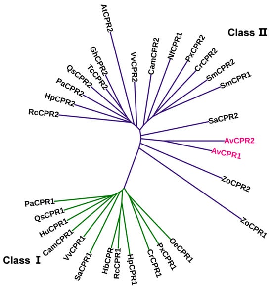 The phylogenetic tree for CPR proteins in A. vilmorinianum and other plants was constructed using the MEGA 6 program with the neighbor-joining algorithm (Figure 2). The phylogenetic analysis of CPRs showed that plant CPRs were clustered into two groups, named class I and class II. Both AvCPR1 and AvCPR2 were grouped in class II.