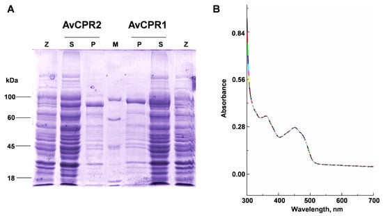To confirm the functions of AvCPRs, AvCPR1 and AvCPR2 were heterologously expressed in BL21 (DE3). To increase the solubility of AvCPRs, 51 and 55 amino acids, the N-terminal membrane-anchoring regions of AvCPR1 and AvCPR2, respectively, were truncated. SDS-polyacrylamide gel electrophoresis (SDS-PAGE) results showed that the truncated AvCPR1 and AvCPR2 were expressed in soluble forms after induction with IPTG for 12 h (Figure 3A). Similar to other plant CPRs, the recombinant protein of AvCPRs showed characteristic absorbance bands of a flavoprotein with prominent peaks at 450 and 380 nm (Figure 3B).