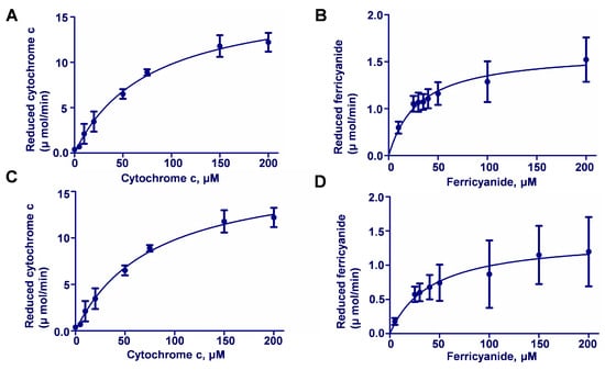 Enzyme activity assay of recombinant proteins of AvCPRs. (A) The kinetic parameters of AvCPR1 for cytochrome c. (B) The kinetic parameters of AvCPR1 for K3Fe(CN)6. (C) The kinetic parameters of AvCPR2 for cytochrome c. (D) The kinetic parameters of AvCPR2 for K3Fe(CN)6. Values are means ± SDs (n = 3).