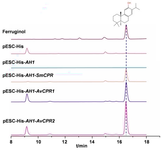 The ORFs of AvCPRs, SmCPR, and CYP76AH1 were inserted into the yeast epitope-tagging vector pESC-His. The miltiradiene-producing yeast strain YJ14 was used as the chassis strain [20]. The transgenic strains co-expressing AvCPRs or SmCPR with CYP76AH1 produced ferruginol (Figure 5). In contrast, ferruginol was not detected in the extracts of the transgenic strains expressing empty vector pESC-His or pESC-His-AH1. Both AvCPR1 and AvCPR2 could support CYP76AH1 catalytic activity similar to that with SmCPR, indicating that AvCPR1 and AvCPR2 were functional NADPH-cytochrome P450 reductases that facilitate P450 activity in vivo.