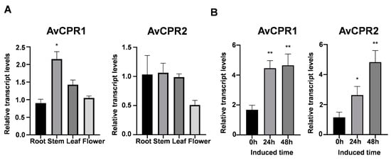 Expression of AvCPRs in A. vilmorinianum. (A) Expression patterns of AvCPRs in different organs. (B) Expression levels of AvCPRs in leaves with MeJA treatment. Values are means ± SDs (n = 3) (* p < 0.05; ** p < 0.01).