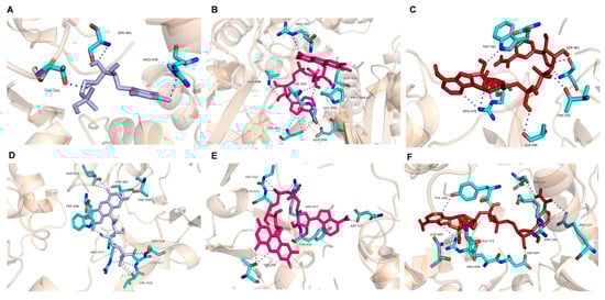 Docking sites of modeled AvCPRs with FMN, FAD, and NADPH. (A) AvCPR1 with FMN. (B) AvCPR1 with FAD. (C) AvCPR1 with NADPH. (D) AvCPR2 with FMN. (E) AvCPR2 with FAD. (F) AvCPR2 with NADPH. The active binding sites were visualized in PyMol 2.0 software.