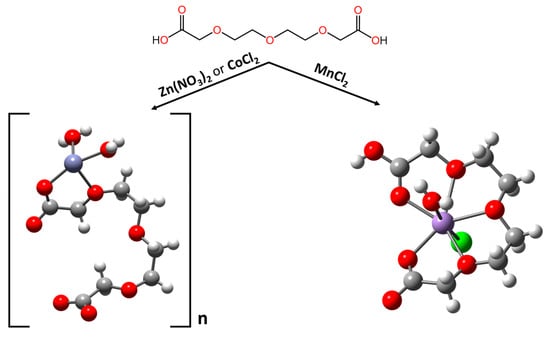 In the design of supramolecular systems, the nature of the interactions involved in the self-assembly process plays a prominent role in determining the structural and dynamic properties of the desired supramolecular assembly. Indeed, the spatial organisation and the reactive behaviour of the building blocks are strongly related to the nature, strength and directionality of the inter- and intramolecular interactions. To date, both organic and inorganic chemistries bring to the table a plethora of different possibilities for connecting the subunits of the whole system, ranging from hydrogen bonds [1,2], which are massively employed by nature in biological systems [3], and weak Van der Waals interactions [4] to coordination chemistry [5,6] and even some covalent, but still reversible, interactions [7,8,9,10]. Selecting the right interaction out of such a wide spectrum of possibilities to achieve the desired results can pose a difficult task. Despite this, in recent decades, coordination chemistry has demonstrated to be the most versatile choice to the self-assembly of topologically defined, 3D supramolecular structures [11,12,13,14,15,16]. The presence of different metal ions in these systems provides access to different coordination geometries, offering a rich range of patterns for connecting and spatially arranging organic ligands in pre-designed topological fashions [17,18]. When playing with binding strengths and preferential coordination geometries, the charges or ionic sizes of various metal ions allow one to control the spatial disposition of the components and define the dynamical features of the system through thermodynamic control. This provides access to complex assemblies that are practically inaccessible through other means and opens the gates to the design of (pre)programmed chemical systems [17]. The design and realisation of metallo-supramolecular architectures are being actively developed for a wide variety of purposes ranging from biomedical applications to nanotechnology and material science [19,20,21,22,23,24,25,26]. The programmed metallo-supramolecular self-organisation requires the encoding of suitable information (a programme) in the ligand strands. This is achieved via an appropriate choice of donor atoms, their spatial arrangement and connections, which all together define the molecular steric/spatial code of the self-organisation process [11,17,27]. The ligand’s code is then read/processed by the metal through its coordination predispositions, and the whole process is finally manifested in the form of a defined coordination architecture. This means that even for complex architectures, the assembly process is not accidental. It becomes possible to achieve different outputs (structures) by changing the reading algorithm (the set of metal ions) while maintaining the same information (the ligand). That being said, the role of the metal ions in such a system goes beyond the simple role of a template. In inorganic chemistry, although self-organisation includes a “templating” step, there is generally not one but several such steps that must act contemporaneously. A single template step requires only the information provided by the ligand’s binding unit and the metal’s geometric coordination preferences. However, in more complex self-organisation processes, additional information stored in the ligand’s backbone contributes to the spatial organisation of the binding sites of the ligands and the metal ions, thus providing an additional level of control over the shape of the final architecture [11]. The process described above is illustrated well via the formation of supramolecular grids [28,29,30,31,32], helicates [33,34,35,36,37] or knots [38,39,40,41,42]. In the first system, the rigidity of the ligand, in synergy with the position and spatial orientation of its binding sites, allows for the correct assembly of grid-shaped structures. The same binding sites with different spatial dispositions and a more flexible connection can lead to helicate structures. Herein, we present three different metallo-supramolecular architectures in a crystalline solid state. These three complexes comprise the same organic ligand, 3,6,9-trioxaundecanedioic acid, which coordinates three different metal ions, Co(II), Zn(II) and Mn(II) (Figure 1). The complexes obtained with CoCl2 and Zn(NO3)2 appear very similar in their crystalline states, showing a helical-shaped coordination polymer, while the complex containing MnCl2 shows a monometallic, nonpolymeric nature.